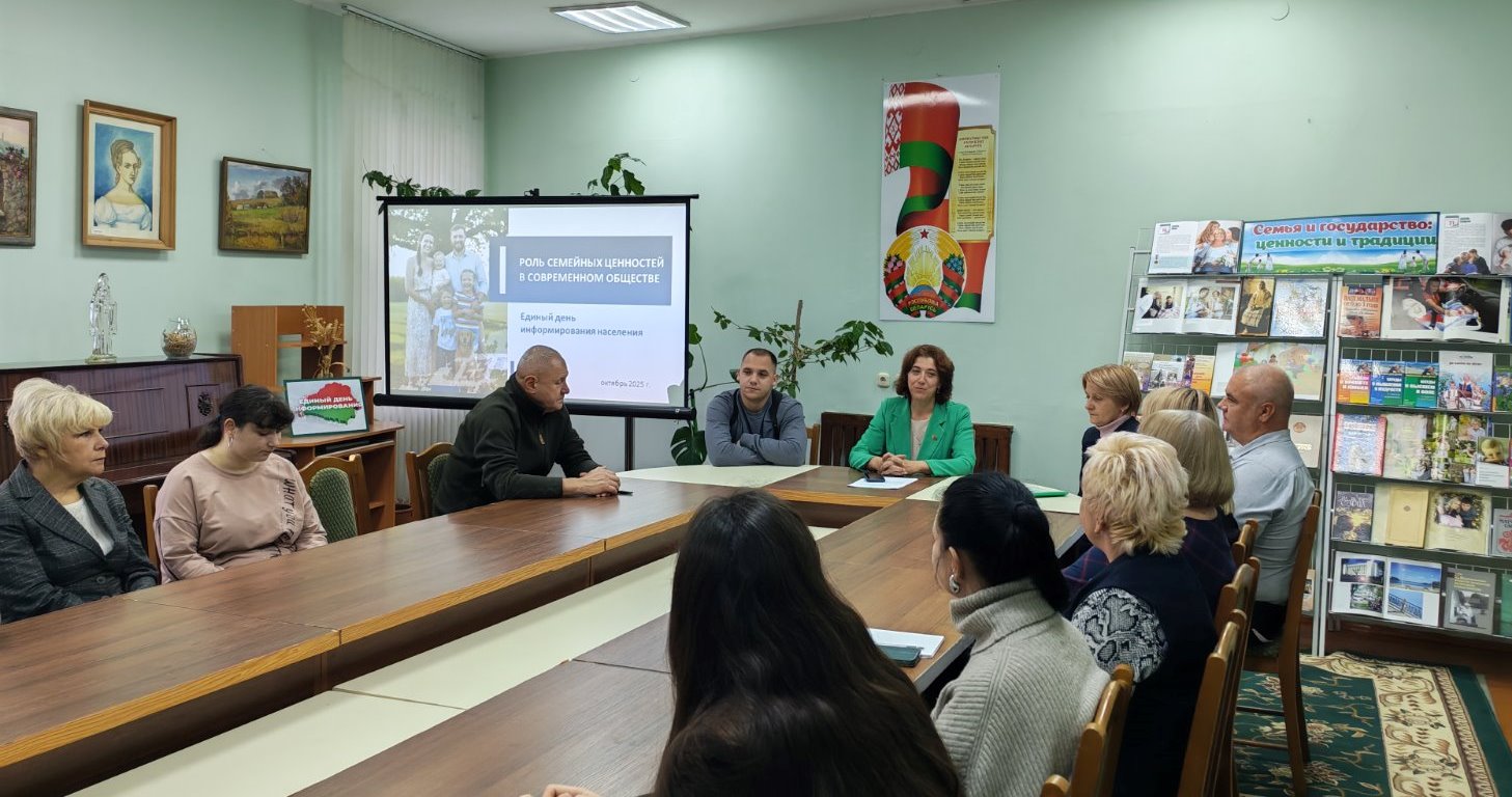 16 октября в рамках единого дня информирования состоялась встреча заместителя председателя Новогрудского райисполкома Скобли Ольги Федоровны с трудовым коллективом Новогрудской районной библиотеки. Мероприятие, проходящее в Неделю родительской любви, посвящено одной из самых актуальных тем – «Роль семейных ценностей в современном обществе». С содержательным докладом о мерах государственной поддержки семьи и материнства в Республике Беларусь выступила начальник отдела пенсий и пособий управления по труду, занятости и социальной защите райисполкома Леонко Инесса Александровна. Библиотека представила книжную выставку «Семья и государство: ценности и традиции».
