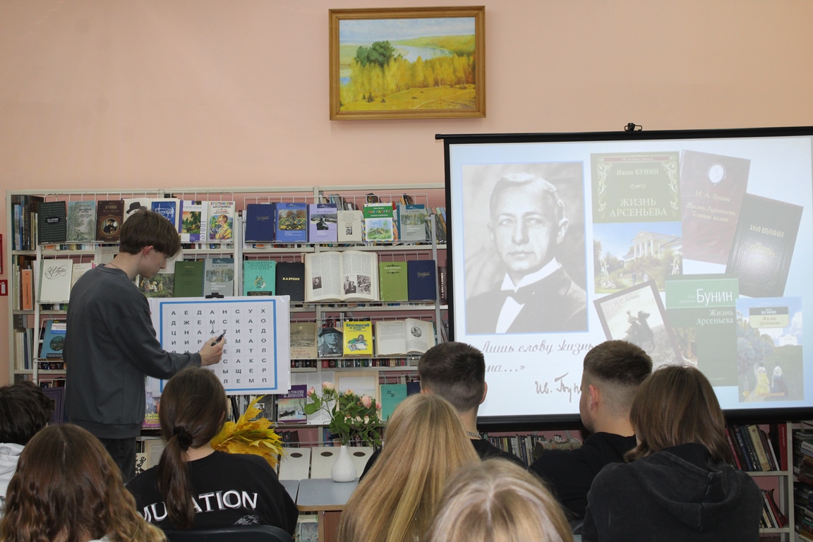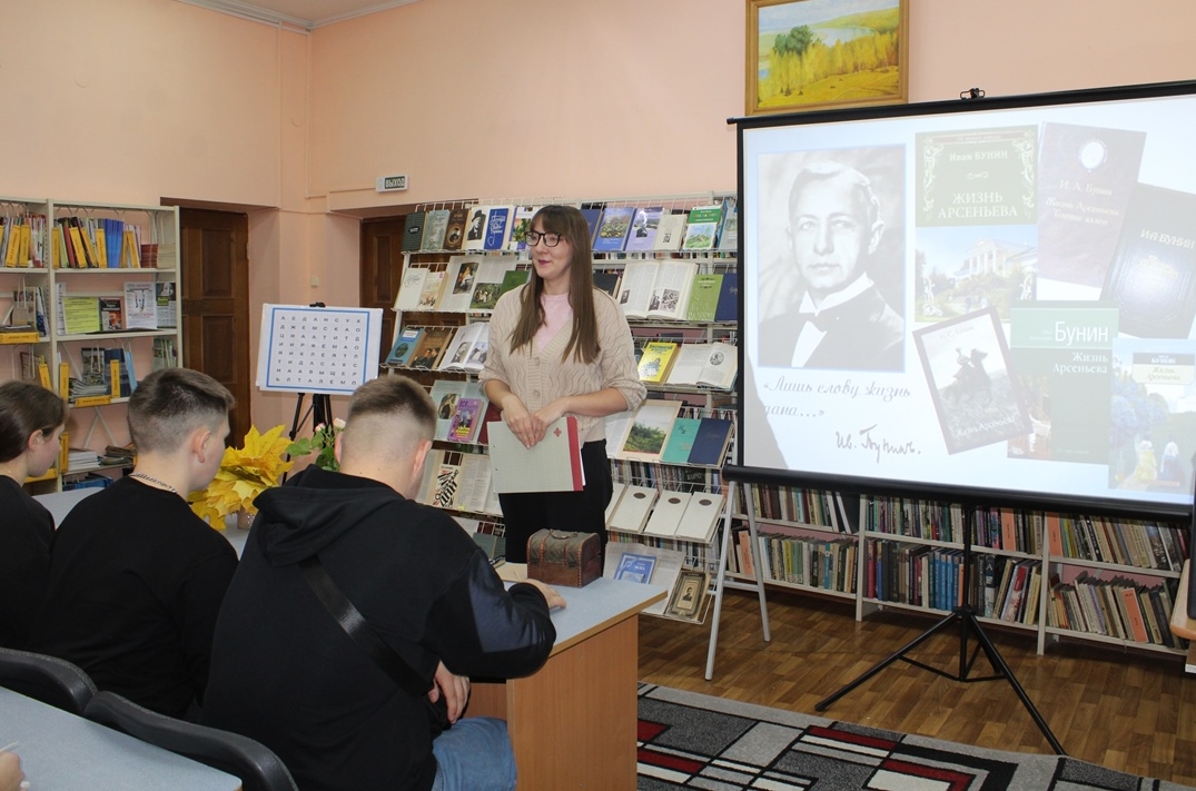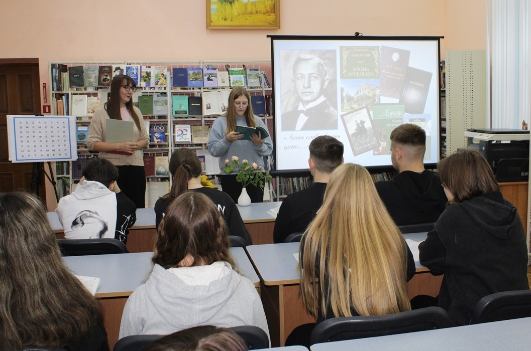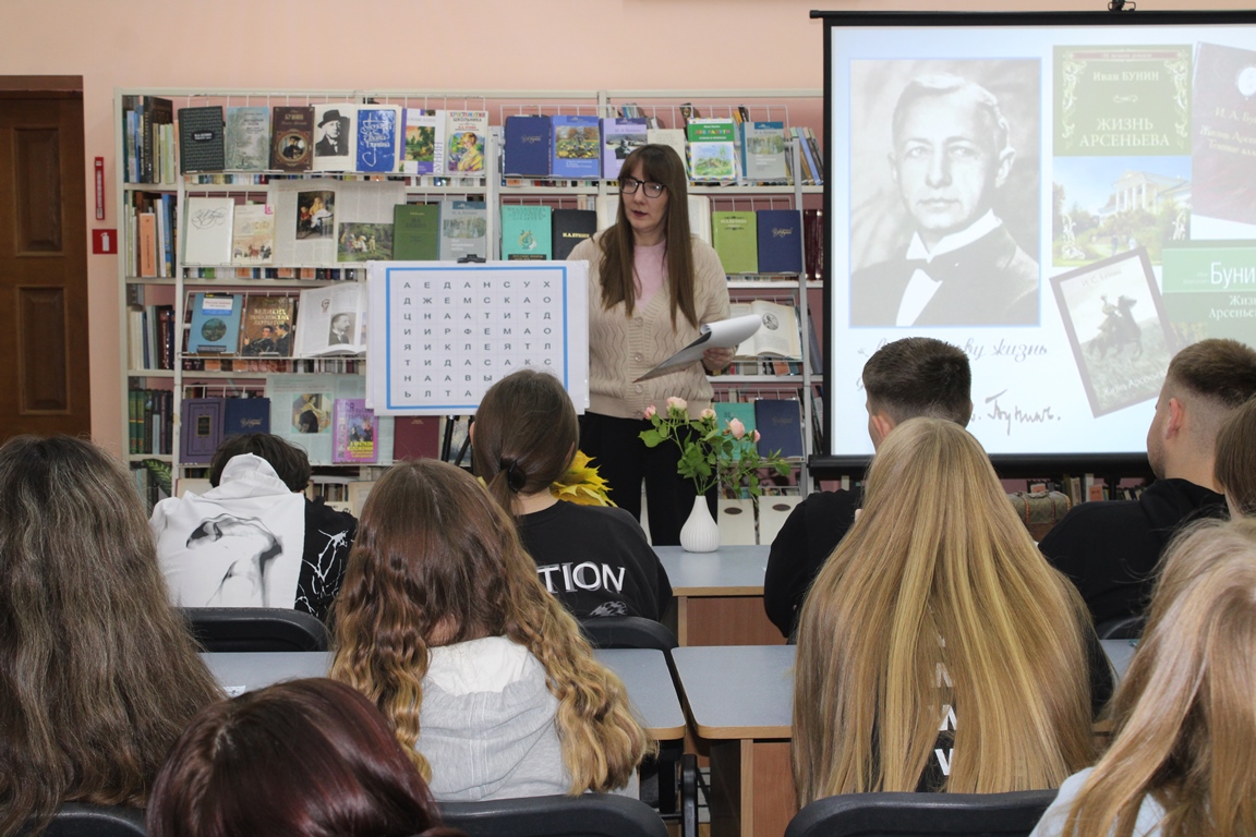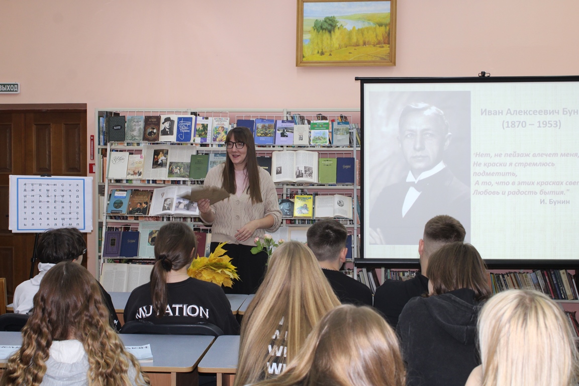 21 кастрычніка Навагрудская раённая бібліятэка ладзіла літаратурную гасцёўню “Иван Бунин. Жизнь в прозе и стихах”, прысвечаную 155-годдзю з дня нараджэння рускага пісьменніка, лаўрэата Нобелеўскай прэміі. Удзел у мерапрыемстве прынялі навучэнцы Навагрудскага гандлёва-эканамічнага каледжа. Агляд-прэзентацыя «Бунін: імя і час» пазнаёміла з жыццёвым і творчым лёсам юбіляра. Шэраг інтэрактыўных інтэлектуальных заданняў адкрылі цікавыя факты з біяграфіі майстра літаратурнага слова, а таксама дазволілі паглыбіць веды пра творчую спадчыну пісьменніка.