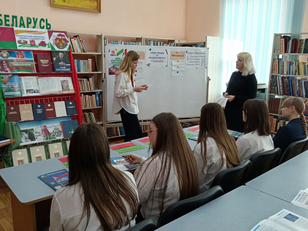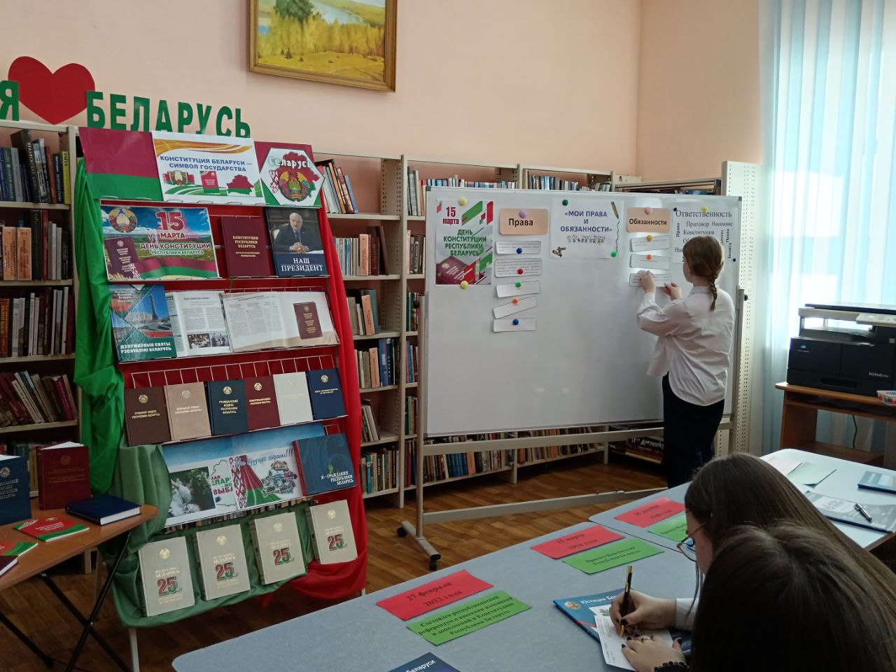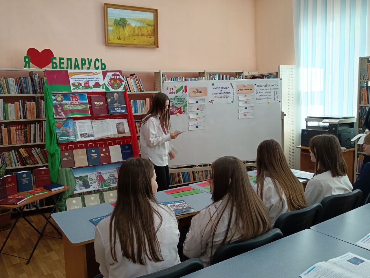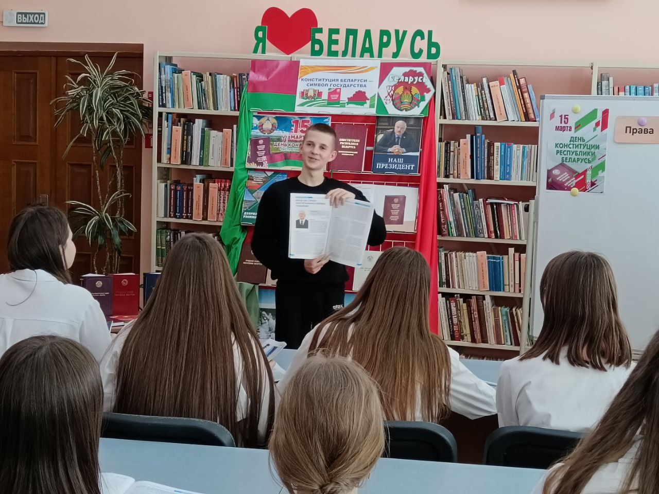 13 сакавіка прайшло мерапрыемства ў рамках праекта “Ведаць закон змоладу”, прысвечанае Дню Канстытуцыі. У прававой студыі для вучняў было падрыхтавана «Канстітуцыя Беларусі — сімвал дзяржавы». Бібліятэкар пазнаёміла прысутных з асноўным законам Рэспублікі Беларусь — Канстытуцыяй, распавяла пра прынятыя змены ў ёй шляхам праведзенага Рэспубліканского рэферэндуму. Таксама Вучні даведаліся, што Асноўны Закон дзяржавы у якім гаворыцца аб правах і абавязках кожнага чалавека, аб тых нормах, якія павінны выконваць усе. Таксама вучні даведаліся, што прававая сістэма дзяржавы пастаянна развіваецца і здзяйсняецца. Вучні былі праінфармаваны пра Дзіцячы прававы сайт, дзе можна паглядзець інфармацыю аб нарматыўных прававых актах, якія тычацца непаўналетніх, аб Нацыянальным прававым Інтэрнэт-партале Рэспублікі Беларусь і інфармацыйна-пошукавай сістэме Эталон. Удзельнікам мерапрыемства была прапанавана гулня «Правіна, праванарушэнне, злачынства». Падчас групавой працы навучэнцы разгледзелі жыццёвыя сітуацыі і вызначылі, у якой з іх здзейснена правіна, у якой правапарушэнне, а ў якой— злачынства, выкарыстоўваючы для дапамогі Кодэксы Рэспублікі Беларусь. Хлопцы і дзяўчаты складалі пералік правоў і абавязкаў на дошцы і вучыліся іх вызначаць. Навучэнцы добра справіліся з інтэлектуальным заданнемі “Канстытуцыя Рэспублікі Беларусь”. Падчас мерапрыемства бібліятэкар пазнаёмілі навучэнцаў з юрыдычна навукова-папулярным часопісам “Юстиция Беларуси” і тэматычнымі матэрыяламі на іх старонках. Да мерапрыемства была падрыхтавана аднайменная кніжная выстава.