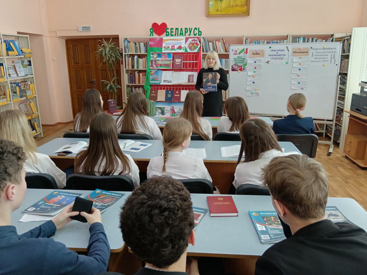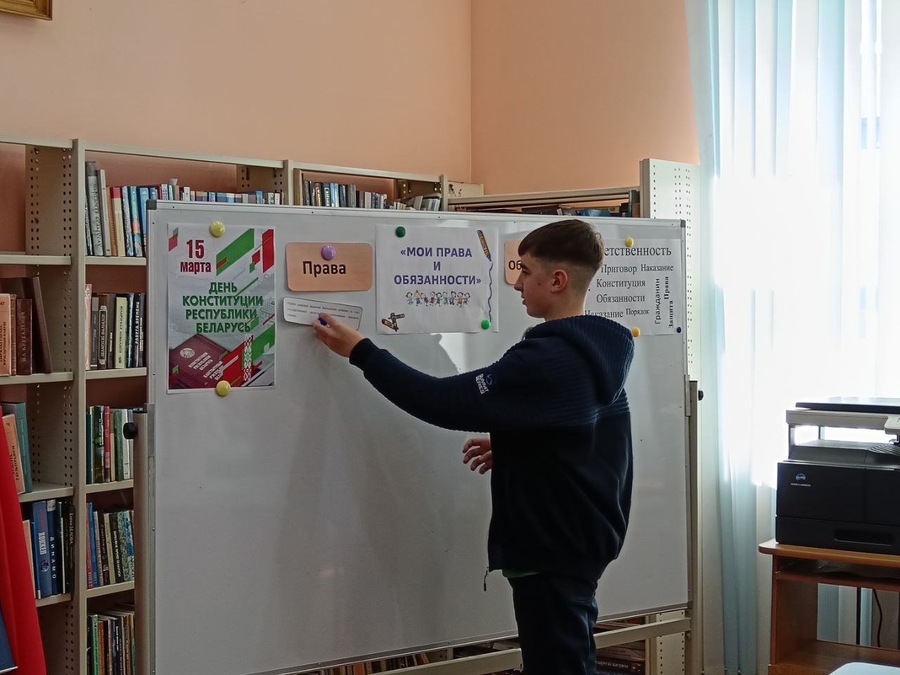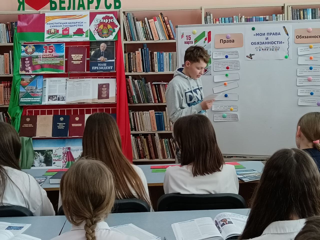 13 сакавіка прайшло мерапрыемства ў рамках праекта “Ведаць закон змоладу”, прысвечанае Дню Канстытуцыі. У прававой студыі для вучняў было падрыхтавана «Канстітуцыя Беларусі — сімвал дзяржавы». Бібліятэкар пазнаёміла прысутных з асноўным законам Рэспублікі Беларусь — Канстытуцыяй, распавяла пра прынятыя змены ў ёй шляхам праведзенага Рэспубліканского рэферэндуму. Таксама Вучні даведаліся, што Асноўны Закон дзяржавы у якім гаворыцца аб правах і абавязках кожнага чалавека, аб тых нормах, якія павінны выконваць усе. Таксама вучні даведаліся, што прававая сістэма дзяржавы пастаянна развіваецца і здзяйсняецца. Вучні былі праінфармаваны пра Дзіцячы прававы сайт, дзе можна паглядзець інфармацыю аб нарматыўных прававых актах, якія тычацца непаўналетніх, аб Нацыянальным прававым Інтэрнэт-партале Рэспублікі Беларусь і інфармацыйна-пошукавай сістэме Эталон. Удзельнікам мерапрыемства была прапанавана гулня «Правіна, праванарушэнне, злачынства». Падчас групавой працы навучэнцы разгледзелі жыццёвыя сітуацыі і вызначылі, у якой з іх здзейснена правіна, у якой правапарушэнне, а ў якой— злачынства, выкарыстоўваючы для дапамогі Кодэксы Рэспублікі Беларусь. Хлопцы і дзяўчаты складалі пералік правоў і абавязкаў на дошцы і вучыліся іх вызначаць. Навучэнцы добра справіліся з інтэлектуальным заданнемі “Канстытуцыя Рэспублікі Беларусь”. Падчас мерапрыемства бібліятэкар пазнаёмілі навучэнцаў з юрыдычна навукова-папулярным часопісам “Юстиция Беларуси” і тэматычнымі матэрыяламі на іх старонках. Да мерапрыемства была падрыхтавана аднайменная кніжная выстава.