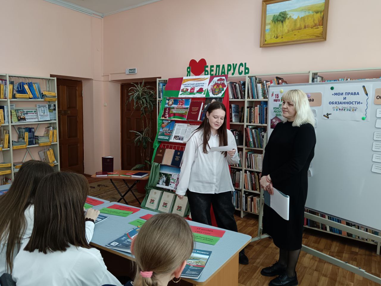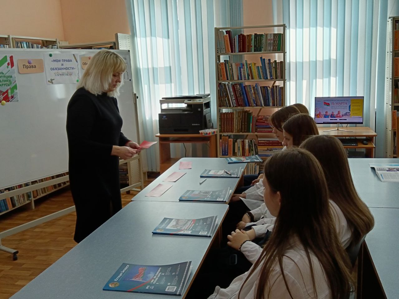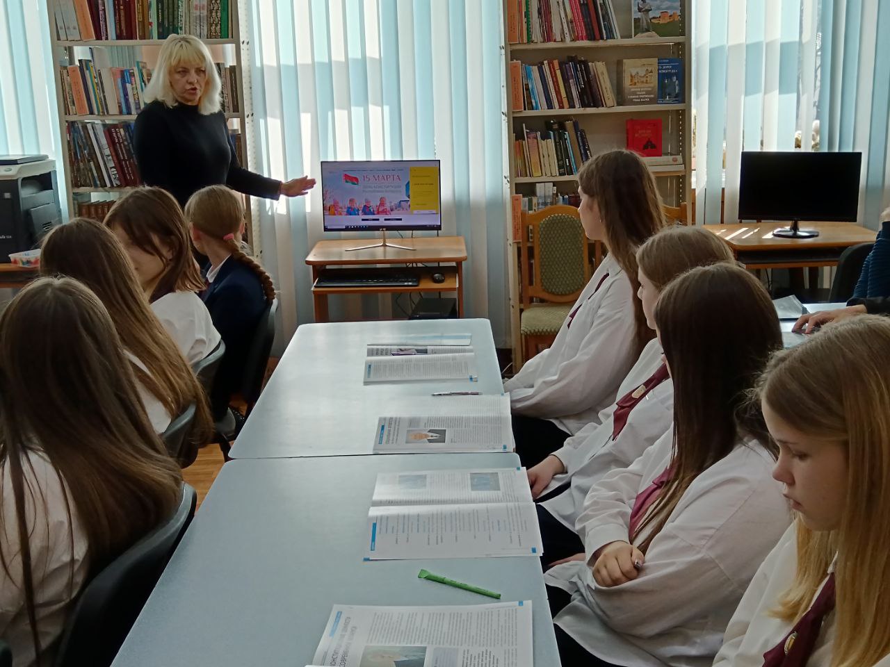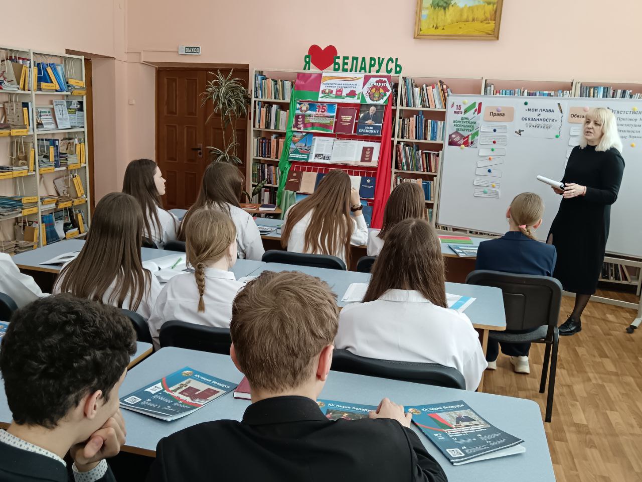 13 сакавіка прайшло мерапрыемства ў рамках праекта “Ведаць закон змоладу”, прысвечанае Дню Канстытуцыі. У прававой студыі для вучняў было падрыхтавана «Канстітуцыя Беларусі — сімвал дзяржавы». Бібліятэкар пазнаёміла прысутных з асноўным законам Рэспублікі Беларусь — Канстытуцыяй, распавяла пра прынятыя змены ў ёй шляхам праведзенага Рэспубліканского рэферэндуму. Таксама Вучні даведаліся, што Асноўны Закон дзяржавы у якім гаворыцца аб правах і абавязках кожнага чалавека, аб тых нормах, якія павінны выконваць усе. Таксама вучні даведаліся, што прававая сістэма дзяржавы пастаянна развіваецца і здзяйсняецца. Вучні былі праінфармаваны пра Дзіцячы прававы сайт, дзе можна паглядзець інфармацыю аб нарматыўных прававых актах, якія тычацца непаўналетніх, аб Нацыянальным прававым Інтэрнэт-партале Рэспублікі Беларусь і інфармацыйна-пошукавай сістэме Эталон. Удзельнікам мерапрыемства была прапанавана гулня «Правіна, праванарушэнне, злачынства». Падчас групавой працы навучэнцы разгледзелі жыццёвыя сітуацыі і вызначылі, у якой з іх здзейснена правіна, у якой правапарушэнне, а ў якой— злачынства, выкарыстоўваючы для дапамогі Кодэксы Рэспублікі Беларусь. Хлопцы і дзяўчаты складалі пералік правоў і абавязкаў на дошцы і вучыліся іх вызначаць. Навучэнцы добра справіліся з інтэлектуальным заданнемі “Канстытуцыя Рэспублікі Беларусь”. Падчас мерапрыемства бібліятэкар пазнаёмілі навучэнцаў з юрыдычна навукова-папулярным часопісам “Юстиция Беларуси” і тэматычнымі матэрыяламі на іх старонках. Да мерапрыемства была падрыхтавана аднайменная кніжная выстава.