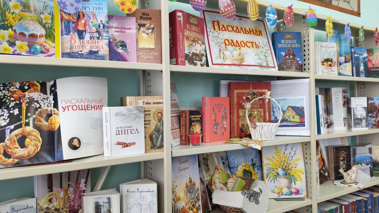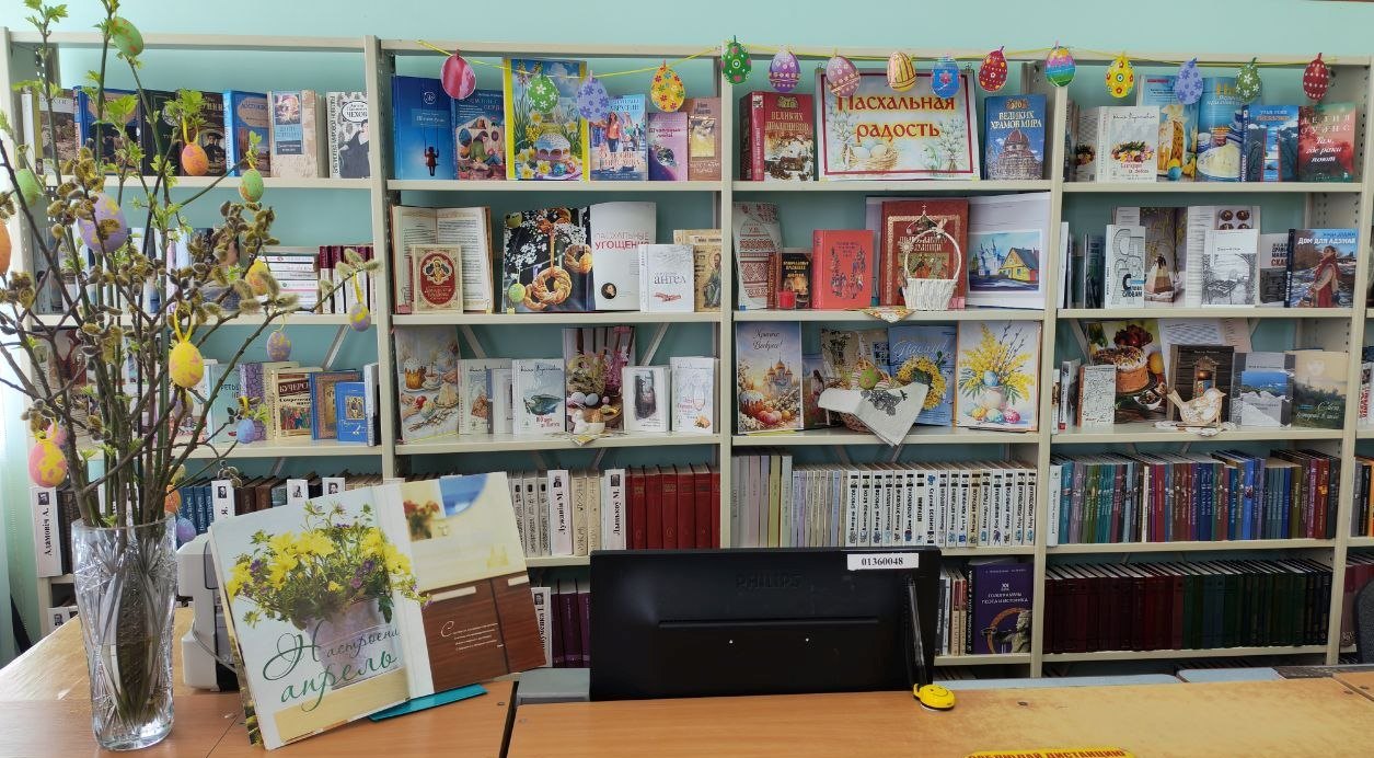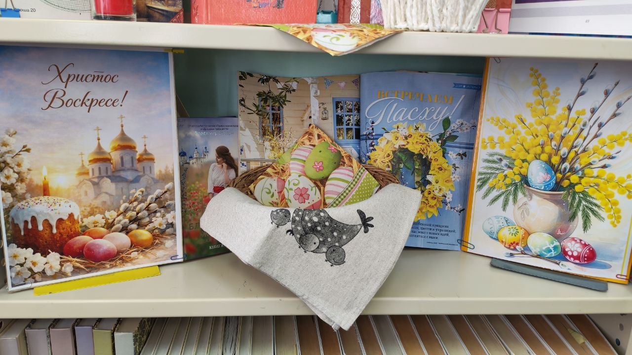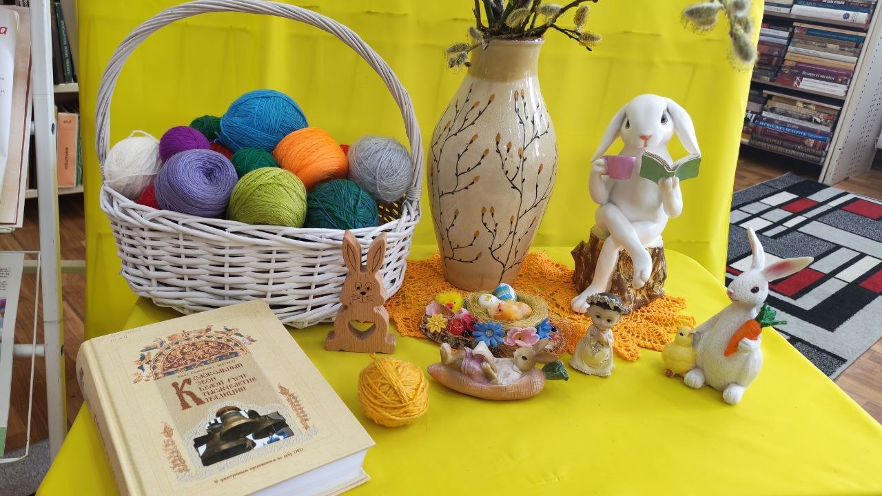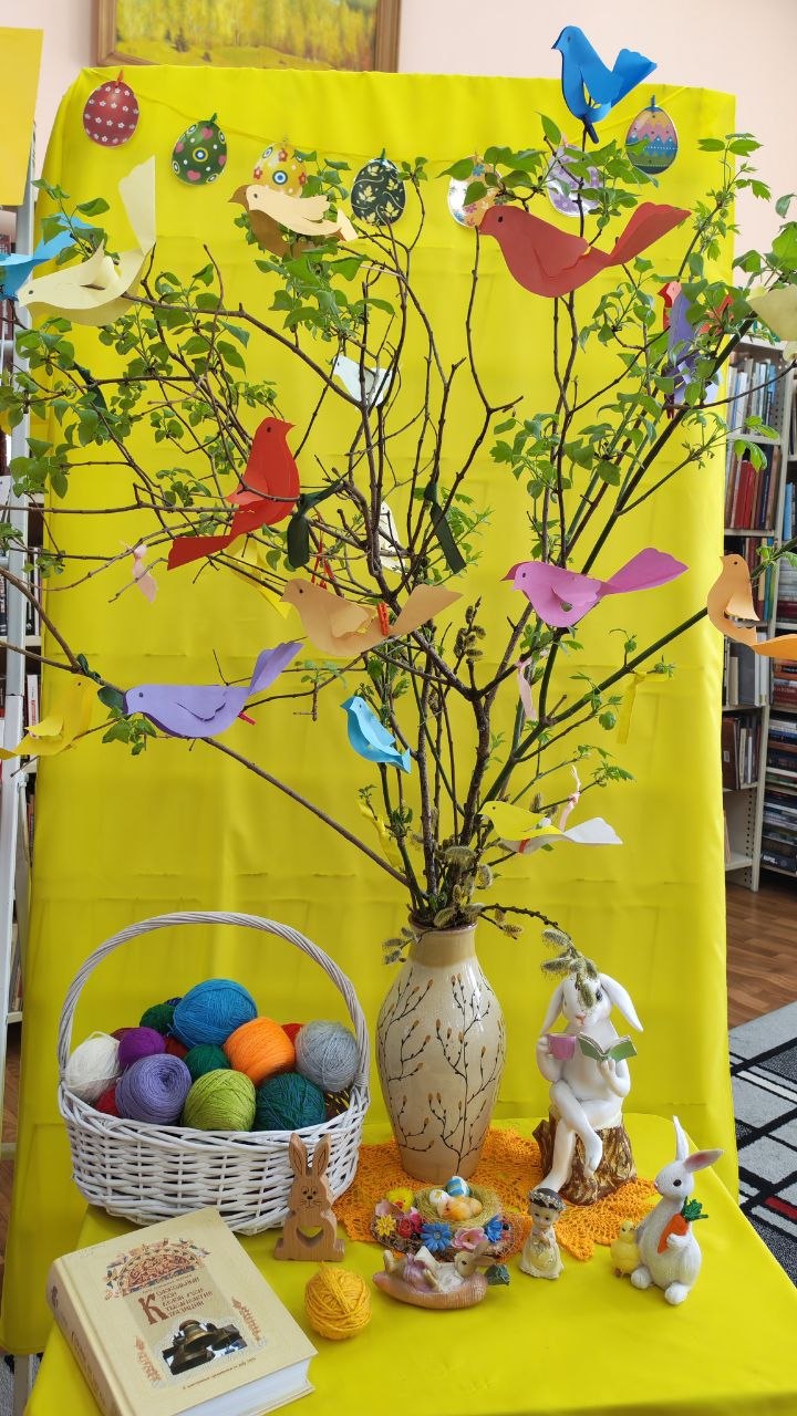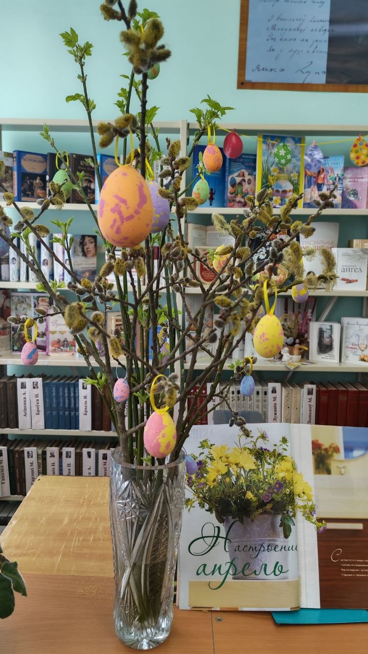 Тематическая инсталляция наполняет пространство библиотеки настроением светлой пасхальной радости.